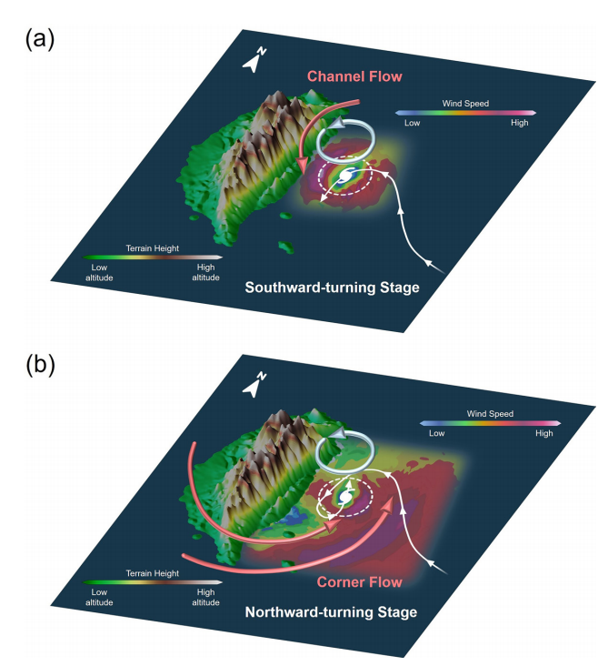 Observations have documented typhoons experiencing pronounced track deflection before making landfall in Taiwan. Such an abrupt turn often results in significant TC track forecast errors, adding challenges to overall TC forecasts. This study found different responsible mechanisms for the southward TC motion at different time periods as the storm approaches the topography. They suggested that the topography-induced large-scale environmental flow turn, the low-level channeling effect, and asymmetries in the midlevel flow all contribute to steering the storm southward.