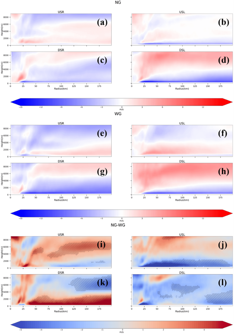 Fig. 12. Radius-height plots of composite shear-related quadrant mean radial velocity (color shaded, m s-1) at 18 hours before SEF. (a)-(d): NG, (e)-(h): WG, (i)-(l): NG-WG difference, respectively. Hatched areas in (i)-(l) indicate differences confirmed through statistical testing.