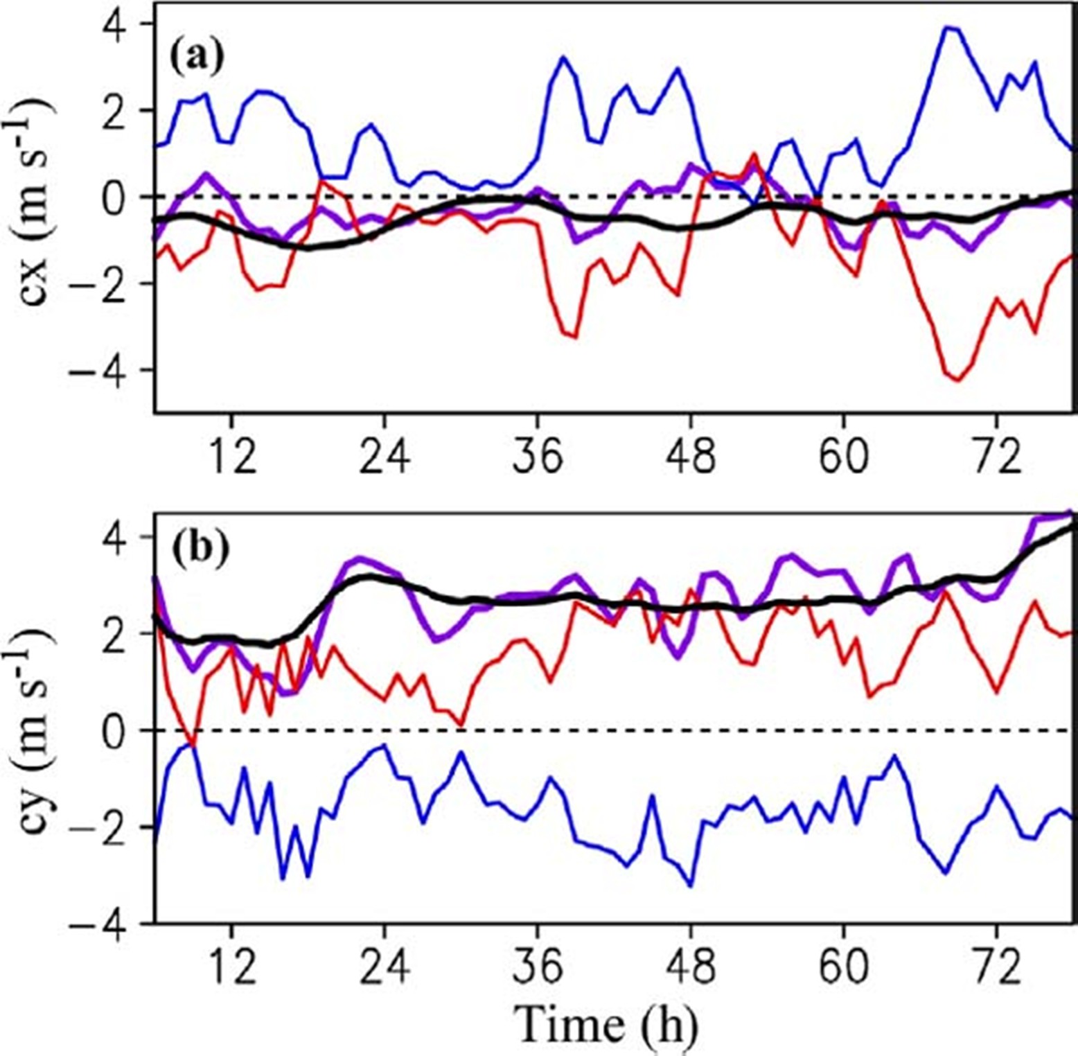 Fig. 1. Time series conventional steering data (thick black) and the contributions of the horizontal advection (HA) in the PVT equation (thick purple): (a) zonal component and (b) meridional component. The composition of HA includes the advection of the symmetric potential vorticity component by the asymmetric flow (HA1) and the advection of the wavenumber 1 potential vorticity component by the symmetric flow (HA2) terms. The anomaly in HA1 with respect to the conventional steering is shown in red, while that in HA2 is shown in blue (after Wu and Chen 2016).