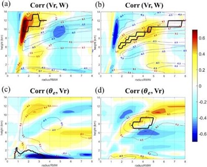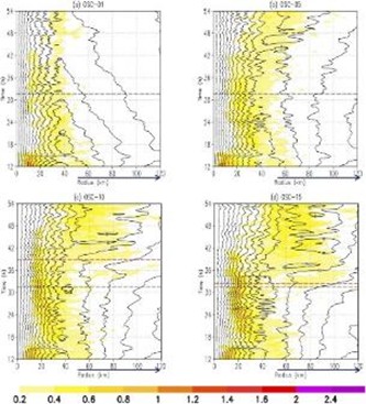 為了更進一步探究颱風外核的海表熱通量對颱風結構與RI過程的影響,Peng and Wu (2020, JAS) 設計不同的數值實驗,限制不同半徑區間的海表熱通量。當限制的範圍在半徑60至90公里時,颱風的強度會明顯減弱。然而當限制的範圍在半徑150公里以外時,在RI前更強的內核中高層上升運動與加熱效率使颱風反而經歷了更強的RI。雖然外核的海表熱通量被抑制,內核風速的增強可從海洋提取更多能量。外核低層更大的穩定度會導致深對流的聚合,伴隨內核位渦的產生與集中,使最強的風速侷限在其中。偏相關分析的結果進一步顯示內核對流與其後6小時強度變化之間具有正相關,以及內外核對流之間則具有競爭關係。