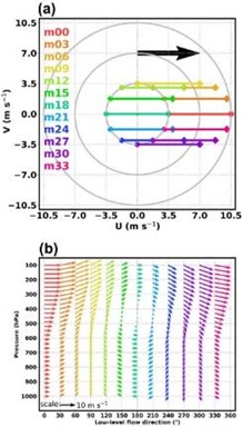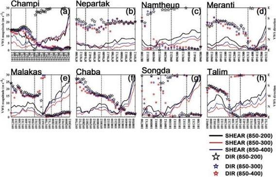 Lee et al. (2021, JAS) 透過模式的理想數值實驗,探討在中等深層風切保持不變的情形下,低層風(LLF)風向對於颱風增強的影響。實驗結果顯示指向上風切左側的LLF成員(FI)與指向下風切右側的LLF成員(SI)相比,前者增強速率較快。FI的內核結構較早被建立、較早達到軸對稱化;而SI的內核結構則相對較弱且不對稱。FI 位於下風切側的海表熱通量增強,可以供給較高的能量給上風切左側的對流。藉由調整海表熱通量的分佈與眼牆對流,此研究提出新觀點指出LLF方向會影響中等風切環境下的颱風的增強。