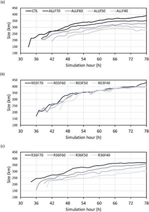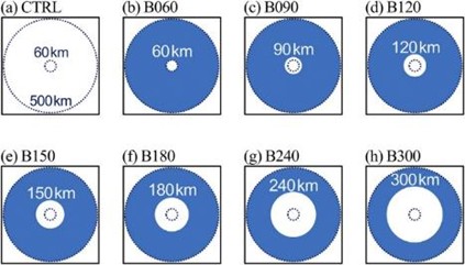 Shen et al. (2021, JAS) 的研究探討颱風內不同半徑區間的海表熱通量對颱風大小的影響。透過敏感性實驗,surface heat flux feedback機制在不同半徑區間有程度不一的削弱。實驗結果顯示當海表熱通量在整個模式範圍都被限制時,將會形成較小的颱風。颱風大小對於外核海表熱通量的敏感度高於內核。當內核的海表熱通量被限制時,減弱的雨帶與其伴隨的次環流減弱被限制在內核區,對於外核絕對角動量的向內輸送影響有限,因此對於颱風大小沒有明顯影響。然而,當外核的海表熱通量被限制時,減弱的雨帶與次環流使自外部向內輸送的絕對角動量明顯減少,形成較小的颱風。