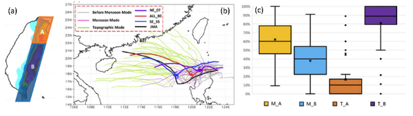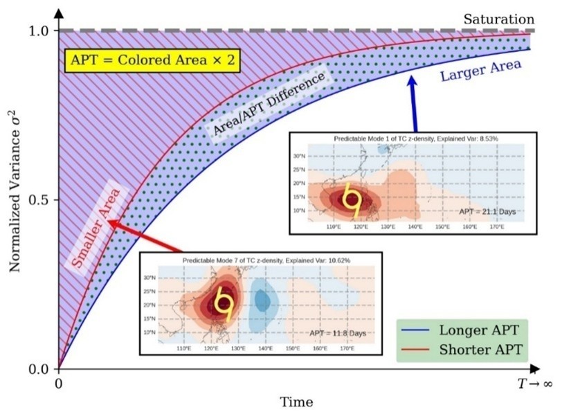 不同於受初始條件影響的天氣尺度(3-7天)決定性預報,以及受到強烈的邊界條件(海氣交互作用)影響的季節預報,次季節預報介於傳統預報訊噪比(signal-to-noise ratio)最小的位置,使得熱帶氣旋在2-5週的預報尤具挑戰性,也因而被稱為「可預報度沙漠」(Predictability Desert)。此研究利用Average Predictability Time (APT)方法探討颱風路徑密度在ECMWF S2S再預測系集的可預報度。當中最可預報的APTM-1,其APT為大約三週,且與BSISO、季風變異度密切相關。另一發現是APTM-7跟MRG-TD波活動的連繫。本工作有望幫助提升未來颱風中期預報的準確度,亦明確指出了熱帶變異性如何影響颱風的可預報度。研究成果刊登於npj-氣候與大氣科學(npj-Climate and Atmospheric Science)期刊。