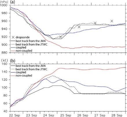 Fig. 4. A time series of (a) the central pressure and (b) maximum wind speed in the best track data from the Japan Meteorological Agency (JMA: black solid curves) and JTWC (black broken curves), the coupled atmosphere–ocean model (blue curves), and the noncoupled atmospheric model (red curves). The best track data are provided every 6 (3) h before (after) 0000 UTC 28 Sep from JMA and every 6 h from JTWC. The central pressures and maximum wind speeds in the models are plotted every 1 h. Crosses indicate estimated values from the dropsonde data deployed in the eye region. Note that the maximum wind speeds provided by the best track data from the JMA and JTWC are 10- and 1-min averages, respectively. The maximum wind speeds in the best track data from the JTWC are shown in (b). This maximum wind speed is multiplied by 0.93 following Harper et al. (2010). Note also that the maximum wind speeds in the coupled and noncoupled models are instantaneous values.