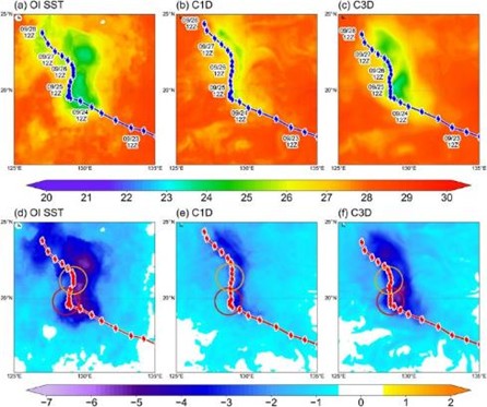吳教授與林依依教授合作進一步探討海洋暖渦所扮演的強烈颱風加強作用角色(Wu et al. 2007a, JAS; Lin et al. 2008, MWR, 2009a, GRL, b, MWR, 2011, TAO)。Wu et al. (2007a, JAS) 設計使用理想的颱風海洋耦合模式來探討海洋暖渦對颱風強度影響的問題。研究中藉由設計不同的海洋熱力結構來探討颱風與海洋的相互影響情形,清楚釐清各物理量對於颱風與海洋交互作用的影響以及海洋暖渦結構所扮演的角色。為凸顯海洋熱力結構的角色,此研究創新提出一個有關ocean eddy feedback 的無因次參數,並藉由近一千五百組的數值實驗,界定出幾個重要物理參數(如颱風移速、海洋混合層厚度、海洋分層結構等)對於颱風與海洋交互作用的定量影響。