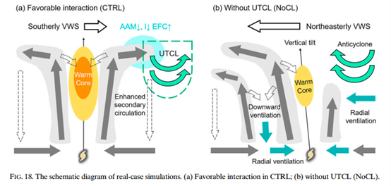 通過模擬颱風尼伯特(2016年)與對流層上部冷低壓(UTCL)的相互作用,深入探討UTCL對熱帶氣旋(TC)結構與強度變化的影響。此外,通過理想化敏感性實驗深入探究導致不同交互作用的特定TC-UTCL配置模式。結果表明,與UTCL交互的熱帶氣旋呈現更為結構,並出現更早的快速增強現象。本文闡述了UTCL與熱帶氣旋強度變化之間因果關係的三種可能機制: 首先,流出擴張能耗降低導致淨熱能增加及增強速率提升。其次,外部渦旋強迫強化次級環流並促進颱風進一步發展。最終,儘管存在UTCL,剪切誘導的低熵空氣向下及徑向通風意外減弱,導致上升剪切象限內核對流增強。總體而言,由於正向效應增強與負向效應減弱,“尼伯特”颱風的UTCL-颱風相互作用過程有利於颱風增強。此外,敏感性實驗結果表明,當UTCL穩定且位於颱風北側或西北側時,產生最為有利的相互作用。