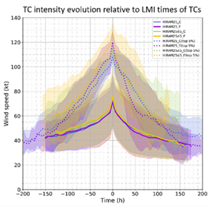 Fig. 2. of Chih et al. (2024, JGR): The HiRAM25 and HiRAM25d5 mean intensity tendency (solid lines) of each CURRENT (C) and FUTURE (F) scenarios and the top-5%-LMI TCs with top 5% lifetime maximum intensity (LMI; dotted lines). Time zero represents the LMI time. Shaded areas indicate the standard deviation.