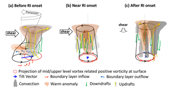 Fig. 1. The adjustment of vortex column, warming anomalies and updrafts during the transition period from before RI onset to after RI onset. Figure 16 of Tao and Zhang (2019). © American Meteorological Society. Used with permission
