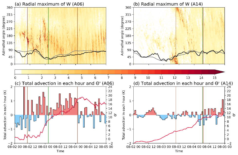 FIG. 20. (a) Time-azimuth plot of radial maximum of W (shaded, m s-1) at 16.5 km height within the annulus of 25-50 km radius. Azimuthal angles (in meteorology angles) of environmental SRF at 17 km height within the annulus of 100-200 km radius and 200-850 hPa VWS within the annulus of 200-800 km radius are denoted in black and grey lines, respectively. (c) Time evolution of accumulated total advection in each hour (bar, K) and θ’ (red line, K) at 15 km height within a radius of 25 km. (b) As in (a), but for A14, and the annulus of 50-100 km is adopted for radial maximum of W due to its larger eyewall. (d) As in (c), but for A14 and within the radius of 50 km due to its larger warm core. Two brown lines in each panel denote the onset and end time of significant intensification, respectively. The green line in each pane denotes the eye formation time.