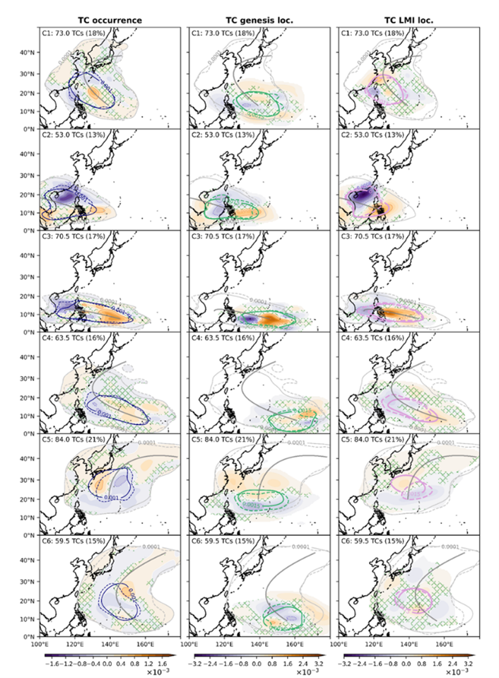 其他TC參數的未來推估在不同TC路徑群集或不同推估結果之間存在差異。例如,研究結果顯示,對於受到路徑群集C1和C5颱風影響的區域,應積極擬定相關的災害減緩及調適策略。推估結果顯示多數TC路徑群集在暖化的未來會出現更大的LMI極值,除此之外,C1 TC路徑群集的平均LMI也呈現顯著的增強訊號,因此C1 TC影響的廣大西北太平洋沿岸地區受颱風災害影響的風險將會顯著提高。部分先前研究中指出的平均LMI位置北移現象僅在一個TC路徑群集中顯現。值得注意的是,在暖化的未來,C5 TC路徑群集的主要LMI區域在四個推估結果中都顯示顯著的北移訊號,同時C5 TC影響日本和朝鮮半島的機會也是提高。
