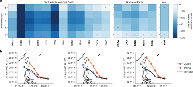 可靠的地球系統預測對於減輕自然災害與促進人類發展至關重要。傳統數值模式雖然功能強大,但仰賴極高的計算成本。近年來,人工智慧(AI)的進展在提升預測效能與效率方面展現出巨大潛力,然而其在許多地球系統領域的應用仍未被充分探索。本國際合作研究提出 Aurora,一個以超過一百萬小時多樣化地球物理數據訓練而成的大規模基礎模型。Aurora 在空氣品質、海浪、熱帶氣旋路徑以及高解析度天氣預測等多項應用上的表現均超越現行作業系統,且計算成本降低了數個數量級。這種顯著的效率提升,使 Aurora 能以更低成本針對不同應用進行微調,代表了推動精準且高效地球系統預測普及化的重要一步。這些成果凸顯 AI 在環境預測中的革命性潛力,並有望讓使用者更便捷地獲取多元且高品質的氣候與天氣資訊。