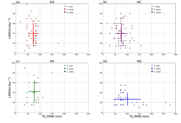 Fig. 14. Scatter plots of LMIR and TS_RMW for favorable-environment cases in different genesis types: (a) EW, (b) MC, (c) MS, and (d) MD. Crosslines indicate the mean and one standard deviation of TS_RMW and LMIR for each genesis type.