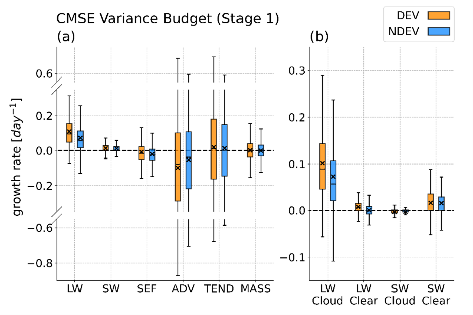 Fig. 10. (a) The box plot depicting all CMSE variance budget terms (day-1) averaged within 500 km × 500 km boxes around vortex centers for the DEV (orange) and NDEV (blue) groups in stage 1, including longwave (LW), shortwave (SW), surface enthalpy flux (SEF), advection (ADV), tendency (TEND), and mass (MASS). (b) Same as in (a), but showing the decomposition of radiative feedbacks, including longwave cloud effect (LW Cloud), longwave clear-sky condition (LW Clear), shortwave cloud effect (SW Cloud), and shortwave clear-sky condition (SW Clear). The boxes indicate the first quartile (Q1), median, and the third quartile (Q3). The whiskers extend to 1.5 times the interquartile range (IQR), and cross markers denote the sample mean. Note that the ordinates in (a) is broken between -0.55 to -0.35 and 0.35 to 0.55 for clarity in presenting data across a large range.