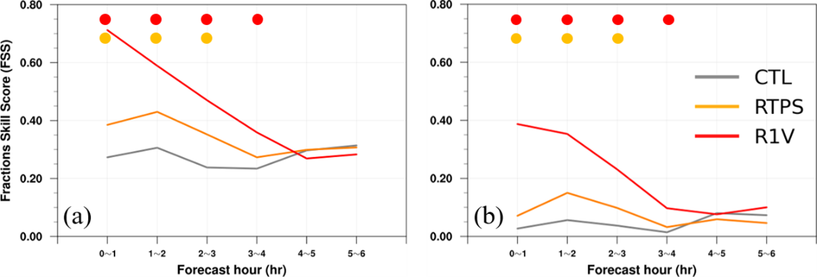 Fig. 12. Fractions skill score (FSS) of hourly accumulated rainfall in 0- to 6-h forecasts initialized from ensemble mean analyses verified against QPESUMS observation. The FSSs are aggregated over 54 forecasts initialized every hour in the period from 0600 UTC 6 June to 1100 UTC 8 June 2022 for the mei-yu case, and computed with a neighborhood radius of 25 km at (a) 6-mm and (b) 20-mm thresholds. The CTL experiment without covariance inflation is gray, the RTPS with only RTPS method is orange, and the R1V combined RTPS and RAN is red. The dots on the top of the plots indicate those forecast hours where the differences to CTL are statistically significant at the 95% confidence level based on a bootstrapping approach with 1000 resamples, and the colors of the dots map to the colors in the legend.