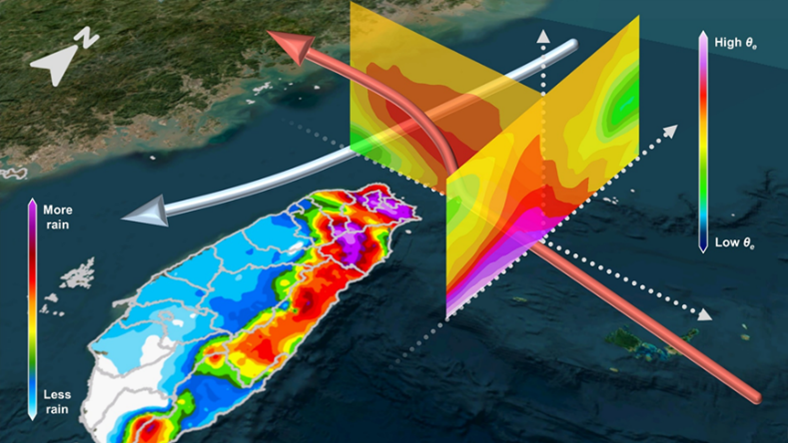 本研究探討2022年尼莎颱風於巴士海峽通過時,於大台北地區所造成劇烈遠距降水之機制。透過五分山雷達雙偏極參數分析與WRF模式系集模擬,顯示東北風與季風槽邊緣暖溼東南風形成鋒生,是觸發豪雨的關鍵,同時證明季風槽邊緣水氣與動量傳輸亦扮演重要角色,並非完全依賴颱風環流,凸顯了季風槽與東北風交互作用於極端降水事件中的角色。