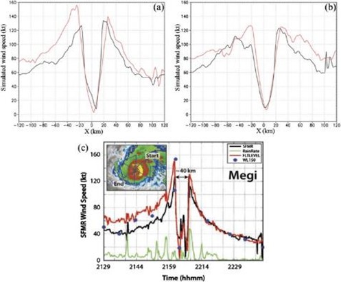在Lee and Wu (2018, JAS) 的研究中,搭配不同的微物理參數化與邊界層參數化模擬梅姬(2010)的RI過程。模擬結果顯示使用WSM6微物理參數化與MN3邊界層參數化(WSM6-MN3)所得到的結果,與WDM6-MN3的模擬結果,是所有參數化組合實驗中颱風發展差異最大的兩組,並檢視這兩組實驗中的RI機制。RI發生前,WDM6-MN3的低層環境較乾、存在較強的下衝氣流,因此在RI期間WSM6-MN3的增強幅度比WDM6-MN3更為明顯。在兩個實驗中,可以在多邊形眼牆頂點位置的低層大氣中頻繁觀察到海表熱通量、位渦、絕對角動量徑向平流、慣性穩定度、超梯度風與對流爆發最大值的出現。WSM6-MN3在內核區有更多對流胞、更持久與厚實的多邊形眼牆、更強健的垂直結構。此研究指出多邊形眼牆的存在提供了有利RI發生的條件。