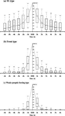Wu et al. (2017, MWR)研究2003-2012年期間臺灣地區超過 5年、10 年和 20 年及 100 mm h-1 的極端小時降水量的統計特徵。所有極端降水記錄根據其發生的同步狀況分為四種類型:熱帶氣旋、鋒面、弱同步強迫和渦旋/切變線類型。熱帶氣旋類型占總記錄的四分之三以上,而鋒面類型和弱同步強迫類型的比例相當(9%-13%)。每小時的極端降水量主要歸因於 5 月至 6 月中旬的梅雨鋒和 7 月至 10 月的熱帶氣旋。熱帶氣旋類型的持續時間往往較長(>12 小時),每小時降水強度的演變呈對稱趨勢,而鋒面類型和弱同步強迫類型的持續時間通常較短(<6 小時),演變模式略不對稱。熱帶氣旋型又可根據熱帶氣旋中心相對於台灣海岸線的位置,再細分為七個亞型。當TC中心位於台灣上空或靠近海岸線,I-IV亞型的空間分布主要取决於TC接近台灣地形的部分。當 TC 中心遠離台灣時,V-VII 亞型的空間分布則由盛行西南氣流或東北氣流的強度以及 TC 環流影響中央山脈的區域共同決定。
