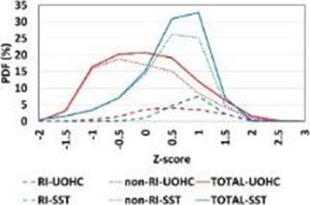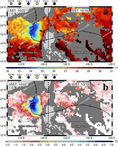 Chih and Wu (2020, J. Climate) 統計1998年至2016年西北太平洋經歷RI的颱風與海洋上部熱力結構(UOHC)、海表溫(SST)之間的關係。統計結果顯示UOHC與SST在RI期間較非RI期間高,但經過高UOHC/SST區域的颱風不一定會經歷RI。颱風內核區的UOHC/SST因為颱風導致的海洋冷卻而降低,而在低緯區域,颱風所經之處的UOHC降低比SST下降更明顯。大部分的颱風RI期間都與更高的UOHC有關,但SST則不存在這種關係。此外,颱風在RI期間的增強率與UOHC 存在統計相關性,但與SST關係不大。在所選資料的期間,颱風經過的UOHC有顯著的增加趨勢。根據不同算法,經歷RI的颱風在過去這段時期會有不同趨勢。UOHC、SST與經歷RI的颱風比例在五種聖嬰類別之間的差異則沒有統計顯著性。