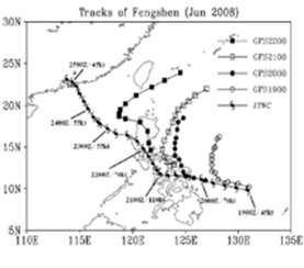 Fig. 1. Joint Typhoon Warning Center (JTWC) best track (typhoon symbols) of Typhoon Fengshen from 0000 UTC 19 Jun to 0600 UTC 25 Jun 2008 and 72-h track forecasts from the NCEP-GFS model initialized on four successive days starting from 0000 UTC 19 Jun 2008. The time interval between each mark is 6 h. Two numbers before and after the slash (“/ ”) indicate the date and the maximum sustained wind in knot (0.514 m s−1) analyzed by JTWC.