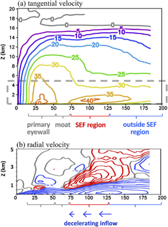 吳教授發表之研究工作(Wu et al. 2016, JAS)探討對流潛熱釋放對於眼牆維持扮演重要角色,全新解釋為何颱風的環狀眼牆結構如何不受二維正壓不穩定結構影響而被破壞,釐清颱風眼牆結構基本gif ks nhe 動力過程。Wang et al. (2016, JAS)透過Sawyer-Eliassen診斷,進一步驗證及支持非平衡動力對於SEF的貢獻/角色。