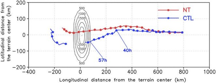 Huang and Wu (2018, JAS) 模擬理想地形對颱風路徑的影響,發現當颱風距離地形較遠時,大尺度的環境流場受到地形影響而使颱風路徑南偏,並使颱風西側的低層風速增加。當颱風內核受到地形顯著影響時,渦旋西側的低層風速由於峽道效應而顯著增加,並且將動量向上傳至中層大氣。敏感性實驗的結果顯示當地形的高度愈高,愈有利垂直動量傳輸,增加颱風中層流場的不對稱。此外,不同的颱風初始位置也會對路徑的偏折造成影響。