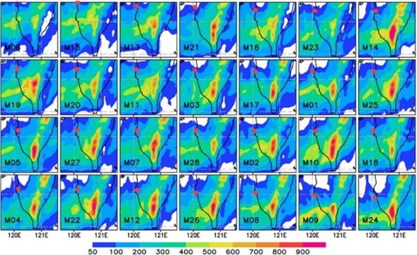 Fig. 10. The 2-day accumulated rainfall (mm; shaded) of 28 ensemble members in southern Taiwan from 0000 UTC 18 September to 0000 UTC 20 September 2010 in the CTL experiment. Their order is based on the latitude of the storm center (plotted by TC mark) as TC departs from the west coast of Taiwan.
